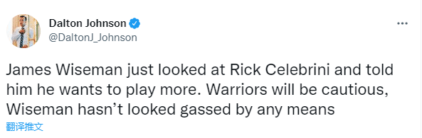 据勇士记者Dalton Johnson透露,怀斯曼在场边看着勇士医疗主管Rick Celebrini,想要更多的出场时间,但勇士队对此仍是非常谨慎。