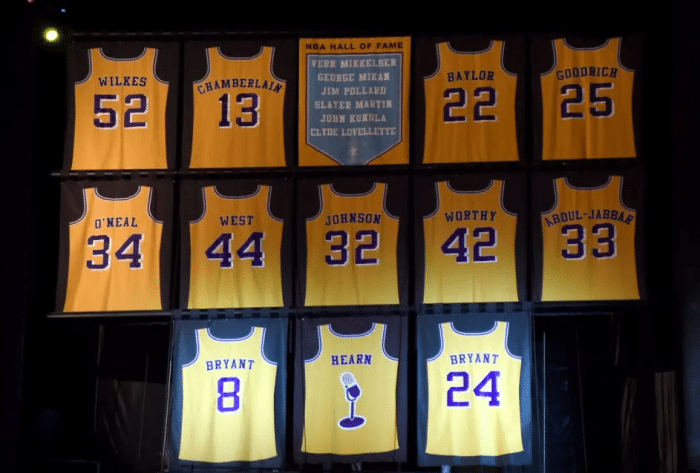 目前湖人队史已经退役了10名球员的球衣——贾马尔-威尔克斯的52号球衣、张伯伦的13号球衣、埃尔金-贝勒的22号球衣、古德里奇的25号球衣、奥尼尔的34号球衣、韦斯特的44号球衣、魔术师约翰逊的32号球衣、詹姆斯-沃西的42号球衣、贾巴尔的33号和科比的8、24号球衣。
