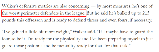 从位置上来看,沃克可能成为蒙克的接班人,他努力成为一名双能卫,但他确实还需要继续进步。上赛季,沃克三分命中率只有31.4%,其中,接球即射三分的命中率是33.2%,空位或大空位的三分命中率只有32.4%。毫无疑问,