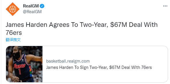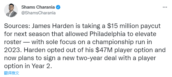 据名记shams报道,哈登将和76人新签2年新合同,第二年是球员选项,哈登新赛季年薪是3200万美元,相比原合同降薪多达1500万美元,美媒跟进报道,这是一份2年6700万美元的新合同。
