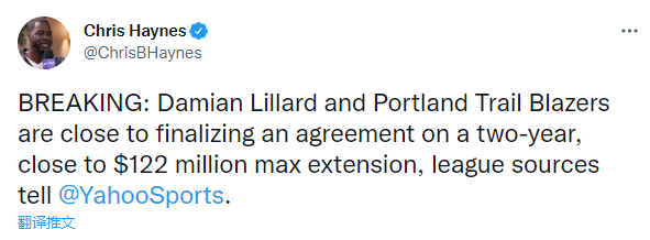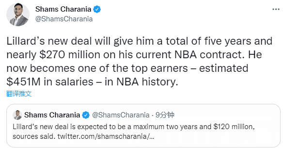 据NBA名记shams和海耶斯报道,利拉德将和开拓者提前续签一份2年1.22亿美元的超级顶薪,合同延长至26-27赛季结束,最后一年拥有球员选项;未来5年,利拉德将从开拓者拿到2.7亿美元,生涯总薪水将达到4.51亿美元,成为NBA史上总薪水最多的球员之一。