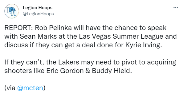 据ESPN名记大卫-麦克马洪报道,湖人总经理佩林卡将在拉斯维加斯夏季联赛期间与篮网总经理肖恩-马克斯面对面交谈,并商讨他们是否能完成欧文的交易;若确定交易无法达成,湖人会把引援目标锁定为埃里克-戈登和巴迪-希尔德这样的射手。
