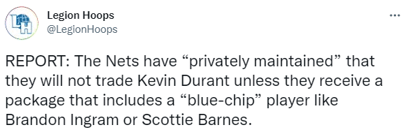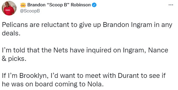 据美媒报道,篮网私下里想要猛龙新星巴恩斯和鹈鹕球星英格拉姆这样的年轻球星,然后促成一揽子大交易,否则篮网不会交易杜兰特;可猛龙拒绝交易巴恩斯;布兰登-罗宾逊更是透露篮网向鹈鹕索要英格拉姆、小南斯和选秀权,但鹈鹕拒绝交易英格拉姆。