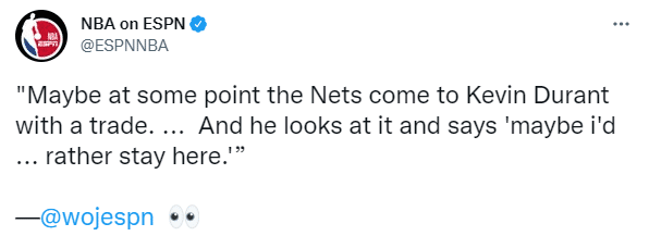 名记沃纳罗斯基在节目中表示,篮网想要促成多队大交易,他们认为杜兰特交易应该是历史级别的,如果交易谈判拖得太久,如果到了8月份KD交易仍未谈成、训练营就要到了;篮网不需要接受他们不想做的交易,到时杜兰特的态度,可能会随着时间的推移也会发生变化, 他绝对有可能留在篮网。