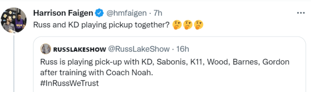 来源:JRS直播07-05 21:39JRS直播07月05日讯 ,美媒晒出了杜兰特、欧文、威少等人一起打球的画面,同场的还有伍德、小萨博尼斯、阿隆-戈登和巴恩斯等人。湖人记者Harrison Faigen转发写道:“威少和KD一起打球?”
