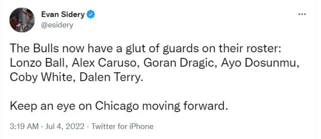 NBA记者Evan Sidery写道:“公牛现在阵容里有一堆后卫,球哥、卡鲁索、德拉季奇、多森姆、科比-怀特、达伦-特里,关注芝加哥接下来会有什么运作。”此前有报道称公牛愿意交易科比-怀特。