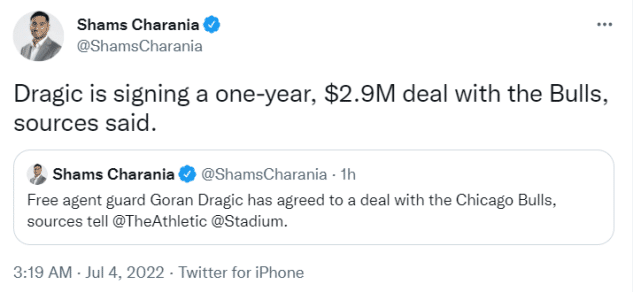 对于东契奇来说,赢球以及和名宿重聚很欢乐,但也有扎心的消息传来。德拉季奇已经和公牛达成一份1年290万美元的合同。此前曾有消息称独行侠计划签约德拉季奇,让斯洛文尼亚的两个老乡联手,但他们一直迟迟没有行动,想等待市场上有没有侧翼选择,或许是这样的态度让德拉季奇等不下去了,他转而签约公牛。不过,公牛现在后场也是人满为患。