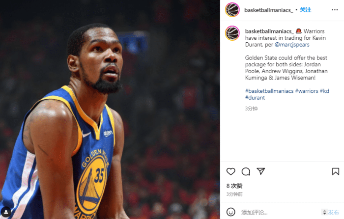 未来杜兰特会去哪儿?此前美记曾爆料勇士有意加入杜兰特争夺战,可以交易的筹码是维金斯、普尔、库明加和怀斯曼;目前这样的交易流言已出现在杜兰特Ins的标记页面,可能是杜兰特本人标记的,也可能是与他有关的人标记的。