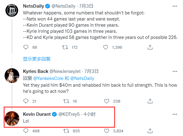 不久前,杜兰特回应养伤白拿4000万美元的质疑声:哈哈。