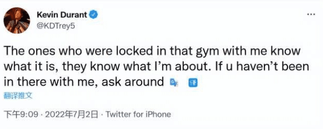 在申请离队之后,杜兰特曾首次发推回应,写道:那些和我在球馆内专注于练球的人知道这是什么,他们知道我在乎什么。如果你还没有跟我一起奋斗过,那就请到处打听一下吧。