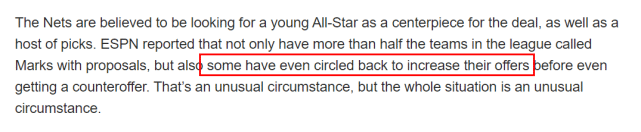 Brian Lewis表示,报价杜兰特的球队很多,但很特别的一点在于,有些球队报出自己的方案后,还没等到篮网还价,又主动增加了自己的筹码。毕竟,竞争杜兰特的球队不少,大家都希望把握住这样难得的一次得到超级巨星的机会。