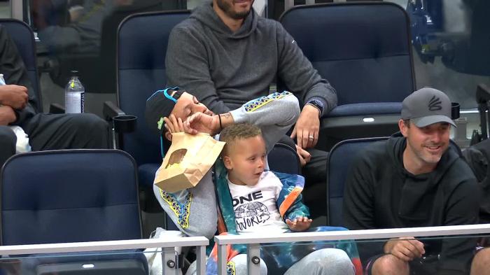库里观战夏联引热议!吃爆米花并做晚安手势