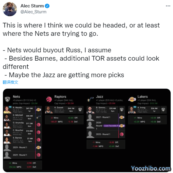 对于目前的情况,篮网跟队记者Alec Sturn列出一笔疯狂的篮网、湖人、爵士和猛龙四方大交易,具体情况如下: