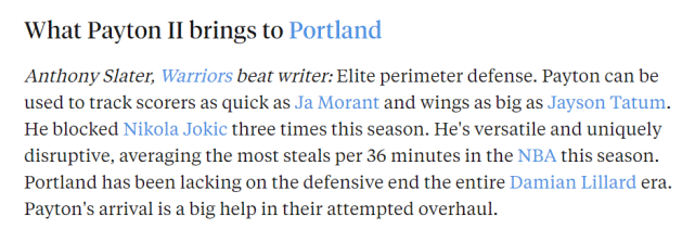 毫无疑问,是精英级别的外线防守。小佩顿可以防速度极快的莫兰特,也可以防高大强壮的塔图姆,他甚至在这个赛季盖了约基奇3个帽。他是非常全能的防守悍将。开拓者的外线防守是一个老问题,现在随着小佩顿的到来有望明显改善。
