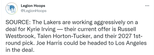 最新报道称,湖人和篮网正在积极讨论的方案是湖人送出威少、霍顿-塔克和2027年首轮签,得到欧文和乔-哈里斯。