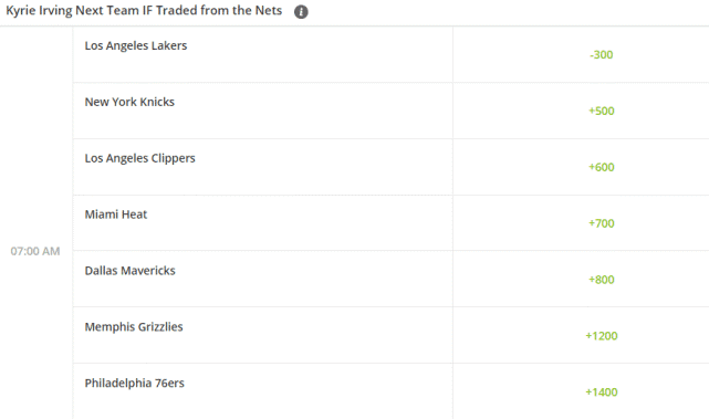 而最新赔率显示,欧文若离开篮网,湖人是最有可能得到他的球队。赔率榜上,湖人(-300)高居第一,而且遥遥领先,随后是尼克斯、快船、热火、独行侠、灰熊和76人。