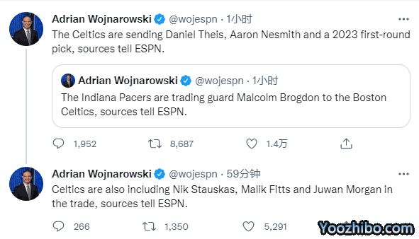 交易详细情况:凯尔特人送走泰斯、内史密斯、尼克-斯陶斯卡斯、马利克-费茨、朱万-摩根和2023首轮签,从步行者引援布罗格登。