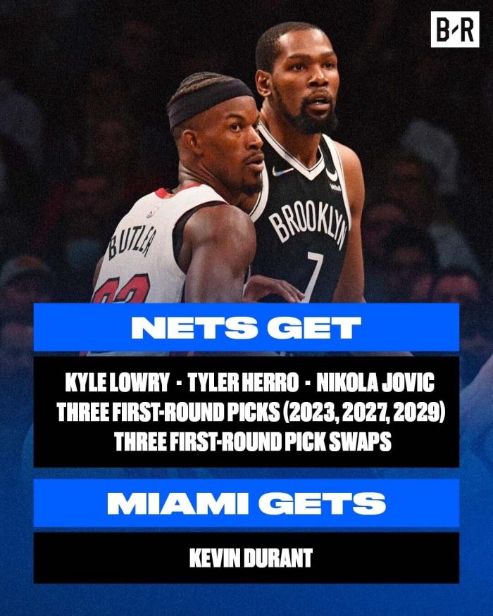 杜兰特已经向篮网申请离队,热火是其心仪下家之一,心仪热火的一大原因是杜兰特想联手巴特勒;Brian Windhorst表示篮网对杜兰特的要价是一位全明星球员+至少3个首轮选秀权;而名记Spears在节目中透露篮网对于杜兰特的要价为:一位年轻的或未来的全明星球员、多个选秀权及选秀互换权、另一名首发级别的球员。