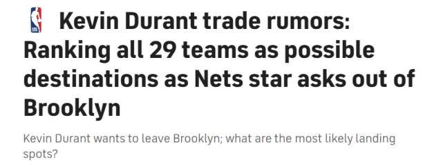 名嘴斯蒂芬-A-史密斯透露,篮网想通过交易杜兰特获得至少两个全明星。知名美媒CBS体育把29支球队,划分了一下等级。大家都想抢杜兰特,但竞争力还是有明显差别的。