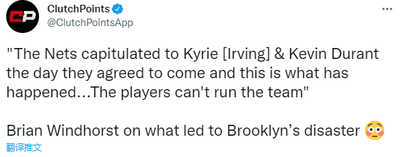 名记更爆料当初杜兰特和欧文一起加盟时,篮网就向他们屈服了,这导致球队突然失控;杜兰特请求离队,名嘴A-史密斯责怪欧文,表示:欧文毁了篮网,我觉得这一切都是他造成的。如果欧文能稳定地出勤打比赛,那么他还会在篮网,杜兰特也会待在篮网。他们可能已经夺冠了,或者至少也是夺冠热门。