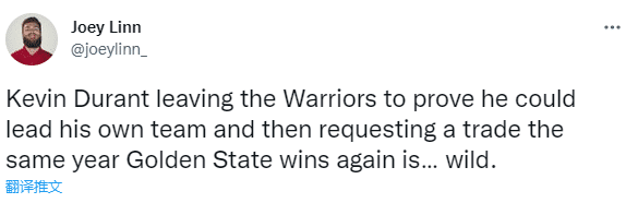 杜兰特申请离队也被批,快船记者Joey Linn发推:杜兰特离开勇士就是为了证明自己可以领导一支球队,但却在金州勇士夺冠的同一年申请了交易,这很疯狂。