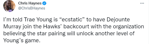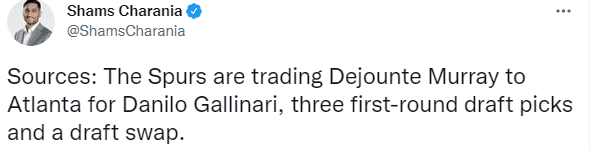 来源:JRS直播06-30 11:21JRS直播06月30日讯,老鹰和马刺正在敲定一笔交易,据ESPN名记沃纳罗斯基和shams联合报道,老鹰把加里纳利和三个首轮选秀权(2023、2025和2027年首轮签)和1个选秀互换权交易到马刺,从而得到穆雷;老鹰5换1引援全明星后卫,新赛季穆雷将搭档特雷-杨出战,吹杨本人欣喜若狂。