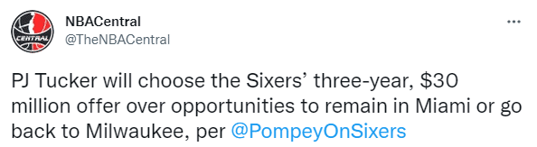 此前PJ-塔克已经决定不执行下赛季价值740万美元的球员选项,跳出合同成为自由球员;由于很难腾出空间,热火无法续约塔克;篮网有意塔克,但他们最多只能给3年2000万美元;而76人能给他3年3000万美元,再加上塔克与哈登的关系很好,最终37岁塔克决定前往费城。