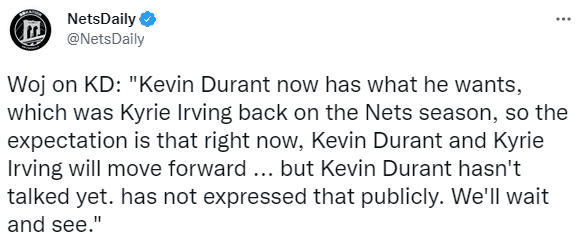 欧文选择留队,名记沃纳罗斯基在节目中表示:现在杜兰特得到了他想要的,那就是欧文回归篮网,所以现在的期待是杜兰特和欧文继续带领篮网前进,不过杜兰特还没有谈过,也没有公开发声过,我们拭目以待。