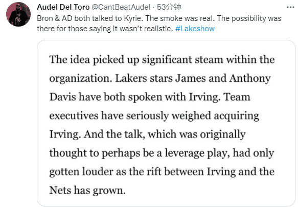 据《洛杉矶时报》湖人记者Don Woike报道,当听到欧文和篮网续约谈僵,前者可能加盟湖人的消息时,湖人队内引起了很大的轰动;Don Woike还透露詹姆斯和浓眉都曾与欧文交谈过,试图招募欧文;湖人高管也认真考虑过引援欧文。