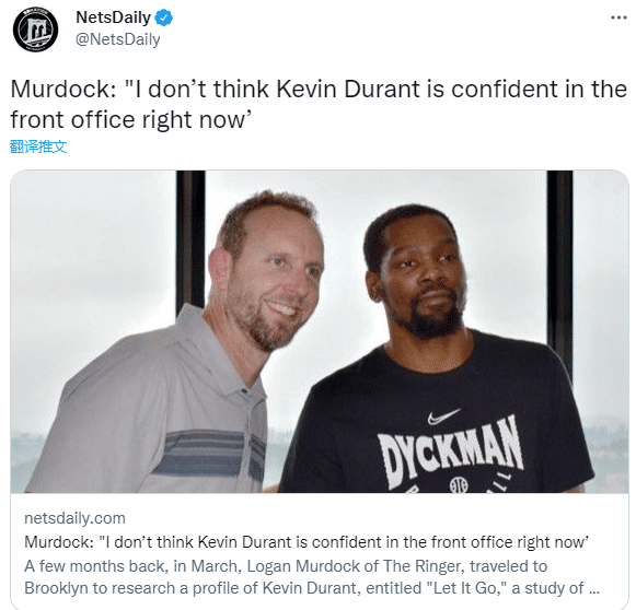 杜兰特深陷离队流言之中,据The Ringer记者LoganMurdock爆料,杜兰特已经对篮网管理层失去信心,他已经数周没有和他们联系了,目前还清楚杜兰特是否处于考虑离队的阶段,但篮网面临的麻烦不仅仅来自欧文,还来自杜兰特。