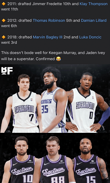 联想到弗雷戴特等人都未在NBA彻底证明自己,而他们身后的球员都取得了更高的成就,不得不为国王感到遗憾,他们每次都拥有更好的选秀顺位,但可惜每次把握机会的能力都不足,选秀的水平有待提升。