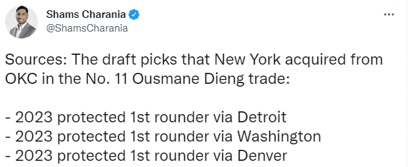 尼克斯用11号签选中迪昂,之后他们将迪昂交易到雷霆,换来三个首轮选秀权,分别来自活塞、奇才和掘金受保护首轮签;在今年选秀大会上,雷霆获得三个乐透秀——榜眼霍姆格伦、11号秀迪昂和12号秀杰伦-威廉姆斯。