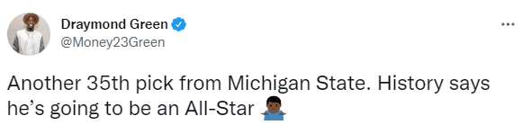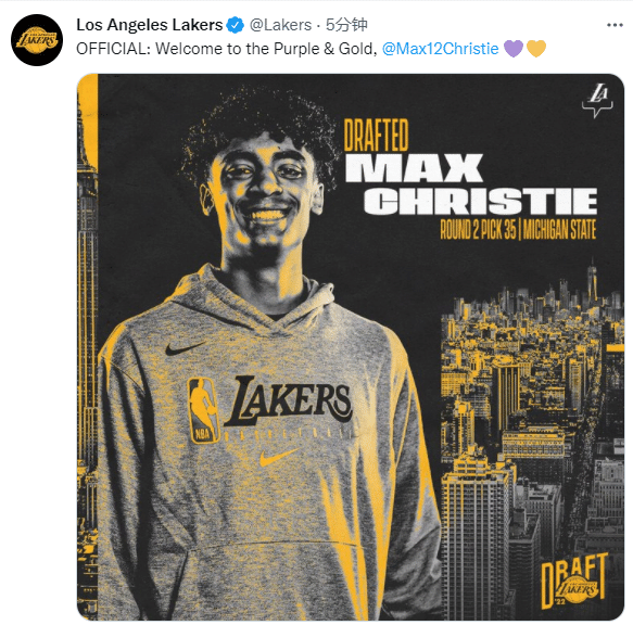 湖人把一个未来次轮选秀权和部分现金送到魔术,换来今年选秀大会上的第35号签;湖人旨在捡漏,他们曾用类似的签选中库兹马、霍顿-塔克等球员;湖人选中马克斯-克里斯蒂,对此勇士球星格林发推:另一个来自密歇根州立大学的第35顺位,历史表明他将成为全明星。