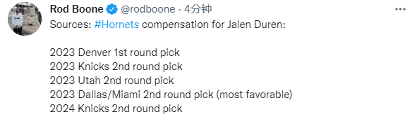 黄蜂把13号秀杰伦-杜伦交易到尼克斯,黄蜂获得4个次轮选秀权和一个首轮权(来自2023年掘金);尼克斯把杜伦和肯巴-沃克交易到活塞,纽约此举旨在清理薪资空间,目标追求布伦森;活塞获得杜伦和沃克,活塞送走2025年首轮签(来自雄鹿),但沃克预计将和活塞达成买断协议,下赛季沃克的薪水是916万美元。