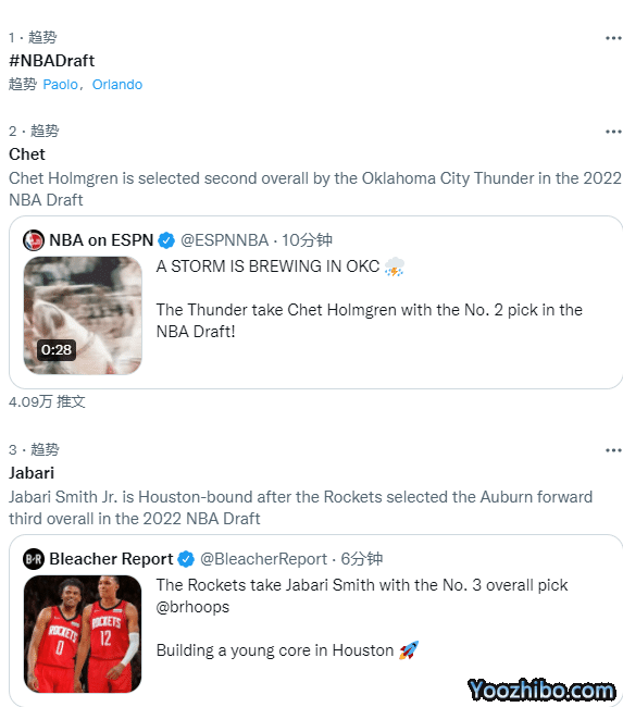 来源:JRS直播06-24 09:30JRS直播06月24日讯 ,NBA正式举行2022年选秀仪式,保罗-班凯罗爆冷逆袭,被魔术选中当选新科状元;雷霆榜眼签选中切特-霍姆格伦,火箭用探花签选中贾巴里-史密斯;班凯罗当选状元冲上推特热搜榜第一名引热议,魔术截胡火箭,名嘴却直呼火箭该感谢魔术和雷霆。