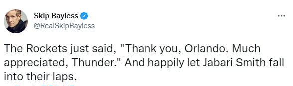 对于今年前三顺位的选秀结果,名嘴斯基普-贝勒斯发推写道:火箭应该说“谢谢你,奥兰多魔术,感谢雷霆”,并愉快地让贾巴里-史密斯落入他们的怀抱。
