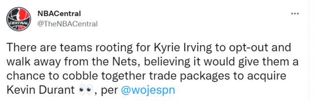 不少球队希望欧文离开篮网,因为他们相信这会让他们有机会通过交易得到杜兰特。当然,杜兰特还在合同期内,只不过当下球星的权力越来越大,若他们申请交易,球队可能也不得不配合。篮网目前已经在悬崖的边上。外界对欧文的吐槽也仍在继续,前NBA球员马特-巴恩斯表示:欧文一直是一个非常自私的人和自私的球员。