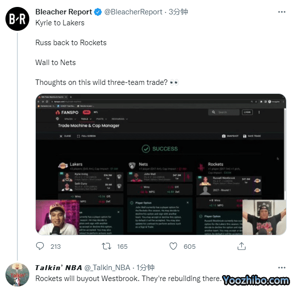 在这一套三方交易方案中,湖人送走威少和2027年首轮选秀权,从篮网得到欧文和赛斯-库里;篮网用欧文和小库里换来沃尔,火箭用沃尔换来威少和首轮签。