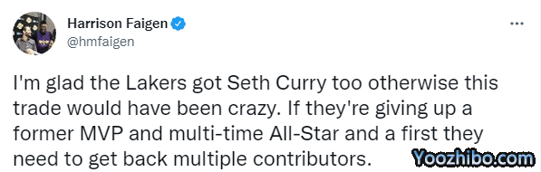 对此,美媒TalkinNBA回复:火箭将会买断威少的合同,他们正在重建;湖人记者Harrison Faigen发推:我很高兴湖人还得到了赛斯-库里,如果他们要放弃一位前MVP和多次入选全明星的球员,他们应该获得多个资产。