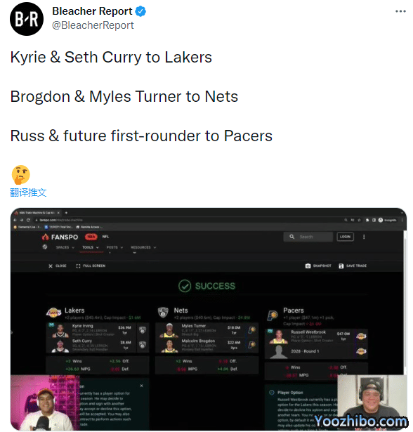 《露天看台》还晒出另外一套三方交易方案,不同的是火箭队换成了步行者,湖人送出的筹码基本不变,仍旧得到欧文和小库里,篮网得到特纳和布罗格登,步行者得到威少和2028年首轮签。