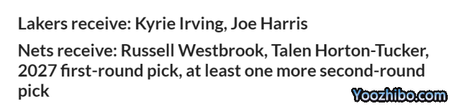具体方案是:湖人送出威少、霍顿-塔克、2027年首轮和至少1个次轮签,得到篮网的欧文和乔-哈里斯。