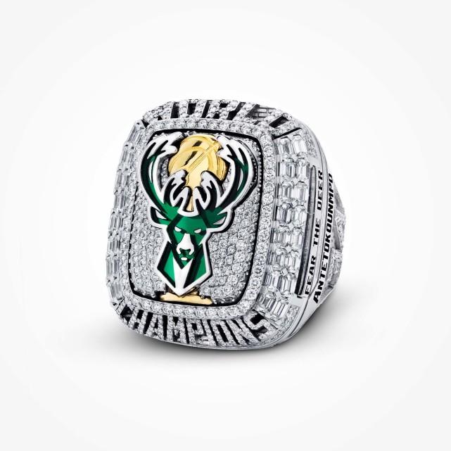 又比如去年雄鹿的总冠军戒指,镶嵌宝石数量多达400颗,其中360颗代表目前老板购买雄鹿后获胜的场数,还有16颗绿宝石代表雄鹿季后赛的获胜场数,16颗钻石代表他们获得过的分区冠军数量。
