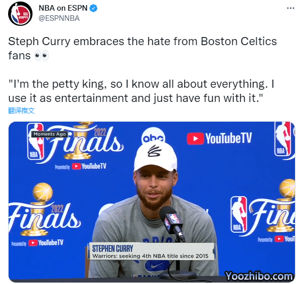 上一次绿军球迷嘲讽库里的家人,库里在G4狂砍43分10篮板,把系列赛拖进天王山;如今勇士3-2领先凯尔特人,G6又来到绿军主场,库里有望大爆发;对于和绿军球迷之间的仇恨,库里今天回应:我是个小国王,所以我什么都知道,我把它当作娱乐,玩得很开心。