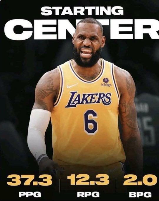 2021-22赛季,詹姆斯为湖人出战56场常规赛,场均贡献30.3分8.2篮板6.2助攻,数据显示,这个赛季,他有28%的时间打小前锋,66%的时间打大前锋,另有5%的时间打中锋。湖人媒体LakersDaily晒出了詹姆斯打中锋的数据:场均37.3分12.3篮板2盖帽,提醒大家别忘了詹中锋有多么可怕。