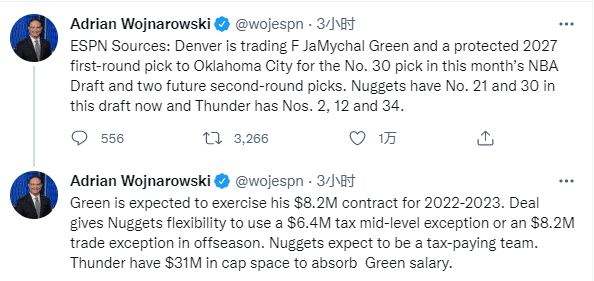 据名记沃纳罗斯基报道,掘金将前锋贾马考-格林和一个受保护的2027年首轮签交易至雷霆,换回本届选秀大会的30号签与两个未来次轮签(2023年与2024年);经过这笔交易,掘金将在今年的选秀大会上拥有首轮21号签与30号签,雷霆则拥有榜眼签、12号签与34号签。