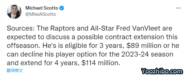 目前范弗里特的合同还剩两年,2023-24赛季拥有球员选项。他今夏有资格与猛龙签一份3年8900万美元的提前续约合同,或者也可以下赛季结束时拒绝执行球员选项,并与猛龙签下一份4年1.14亿美元的续约合同。