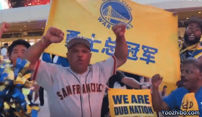勇士的主场出现了很多一面“神秘大旗”,那就是印有“勇士总冠军”的旗帜。这面旗子出现之后,球迷们也都沸腾了,纷纷上前高喊中文的“勇士总冠军”,其他的球迷们也过来,一起庆祝和欢呼,气氛满分。