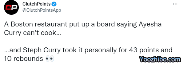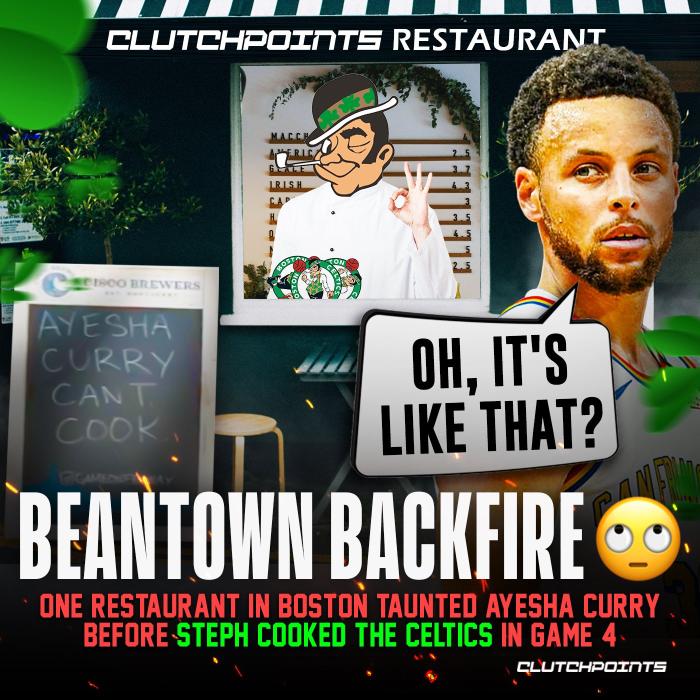 波士顿当地的一家餐馆在门口摆放一个宣传板,上面写着阿耶莎-库里不会做饭,他们用这样的方式嘲讽库里的老婆,目的是想影响库里;结果库里“亲自下厨”,在总决赛第四场投进7记三分并且全场狂砍43分10篮板,强势回应绿军球迷的盘外招。