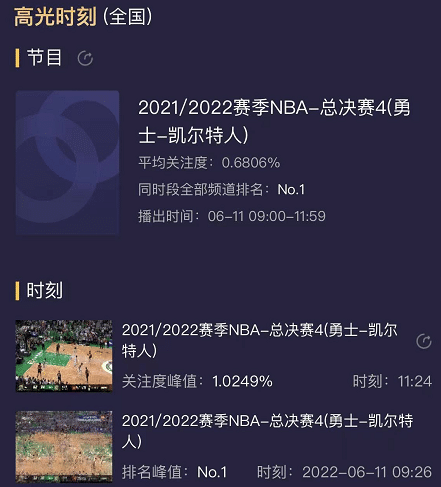 这场比赛的外界的关注度超高,毕竟是勇士赢球就拖入天王山,凯尔特人赢球就夺得“总冠军赛点”。收视率层面,此役平均收视率都超过了0.68%,巅峰时刻的收视率破1%,具体数据是1.0249%,这也是本赛季NBA总决赛第一次收视率破1%;