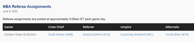 来源:JRS直播06-09 16:39JRS直播06月09日讯 ,NBA官方公布了总决赛G3的裁判名单,他们分别是48号裁判斯科特-福斯特,16号裁判大卫-古斯里,61号裁判 考特尼-科克兰德,替补裁判是74号裁判柯蒂斯-布莱尔。